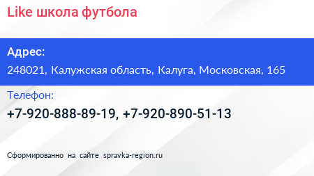 Like, школа футбола по адресу 248021, Калужская область, Калуга, Московская, 165 в дальнейшем Организация, размещена в следующих категориях: