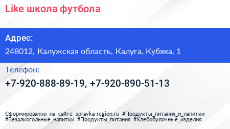 Like, школа футбола по адресу 248012, Калужская область, Калуга, Кубяка, 1 в дальнейшем Организация, размещена в следующих категориях: