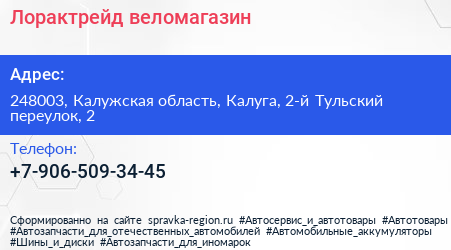 Лорактрейд, веломагазин по адресу 248003, Калужская область, Калуга, 2-й Тульский переулок, 2 в дальнейшем Организация, размещена в следующих категориях: