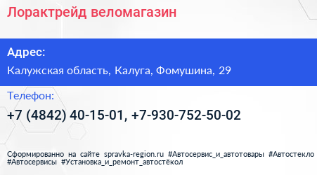 Лорактрейд, веломагазин по адресу Калужская область, Калуга, Фомушина, 29 в дальнейшем Организация, размещена в следующих категориях: