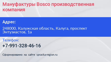 Мануфактуры Bosco, производственная компания по адресу 248000, Калужская область, Калуга, проспект Энтузиастов, 1а в дальнейшем Организация, размещена в следующих категориях: