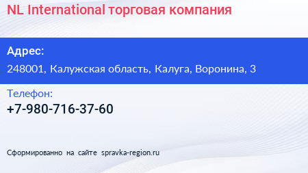 NL International, торговая компания по адресу 248001, Калужская область, Калуга, Воронина, 3 в дальнейшем Организация, размещена в следующих категориях:
