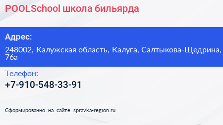 POOLSchool, школа бильярда по адресу 248002, Калужская область, Калуга, Салтыкова-Щедрина, 76а в дальнейшем Организация, размещена в следующих категориях: