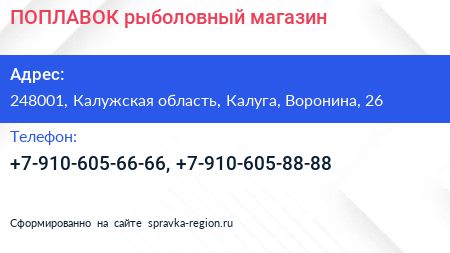 ПОПЛАВОК, рыболовный магазин по адресу 248001, Калужская область, Калуга, Воронина, 26 в дальнейшем Организация, размещена в следующих категориях: