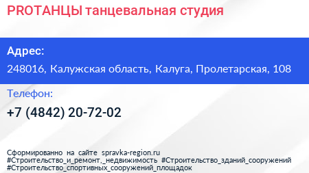 PROТАНЦЫ, танцевальная студия по адресу 248016, Калужская область, Калуга, Пролетарская, 108 в дальнейшем Организация, размещена в следующих категориях: