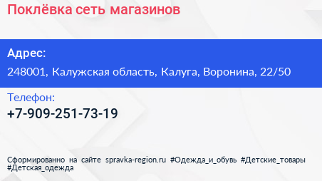 Поклёвка, сеть магазинов по адресу 248001, Калужская область, Калуга, Воронина, 22/50 в дальнейшем Организация, размещена в следующих категориях: