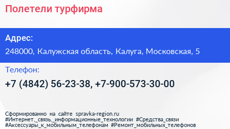 Полетели!, турфирма по адресу 248000, Калужская область, Калуга, Московская, 5 в дальнейшем Организация, размещена в следующих категориях: