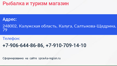 Рыбалка и туризм, магазин по адресу 248002, Калужская область, Калуга, Салтыкова-Щедрина, 79 в дальнейшем Организация, размещена в следующих категориях: