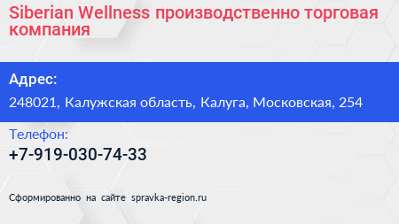 Siberian Wellness, производственно-торговая компания по адресу 248021, Калужская область, Калуга, Московская, 254 в дальнейшем Организация, размещена в следующих категориях: