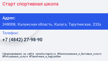Старт, спортивная школа по адресу 248008, Калужская область, Калуга, Тарутинская, 232а в дальнейшем Организация, размещена в следующих категориях: