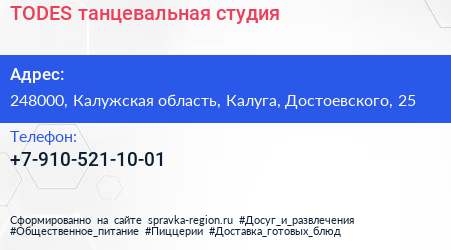 TODES, танцевальная студия по адресу 248000, Калужская область, Калуга, Достоевского, 25 в дальнейшем Организация, размещена в следующих категориях: