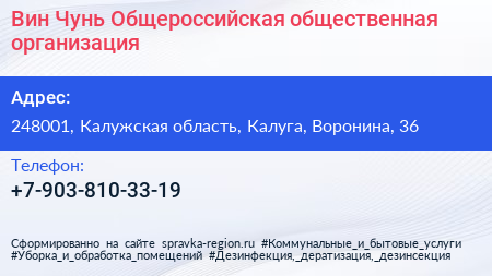 Вин Чунь, Общероссийская общественная организация по адресу 248001, Калужская область, Калуга, Воронина, 36 в дальнейшем Организация, размещена в следующих категориях: