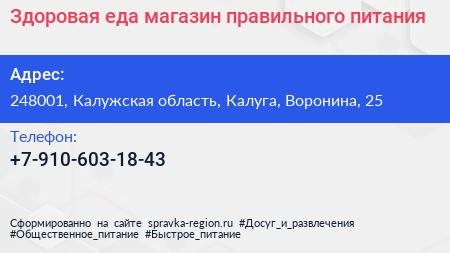 Здоровая еда, магазин правильного питания по адресу 248001, Калужская область, Калуга, Воронина, 25 в дальнейшем Организация, размещена в следующих категориях: