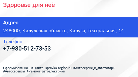 Здоровье для неё по адресу 248000, Калужская область, Калуга, Театральная, 14 в дальнейшем Организация, размещена в следующих категориях: