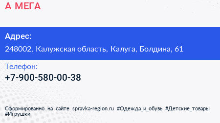 А-МЕГА по адресу 248002, Калужская область, Калуга, Болдина, 61 в дальнейшем Организация, размещена в следующих категориях: