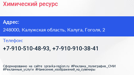 Химический ресурс по адресу 248000, Калужская область, Калуга, Гоголя, 2 в дальнейшем Организация, размещена в следующих категориях: