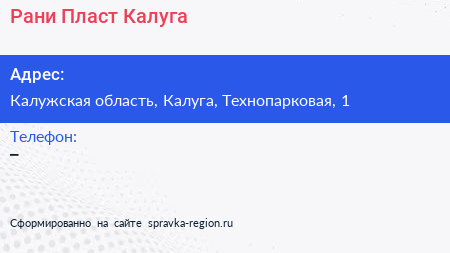 Рани Пласт Калуга по адресу Калужская область, Калуга, Технопарковая, 1 в дальнейшем Организация, размещена в следующих категориях: