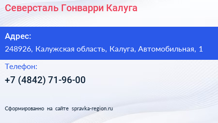 Северсталь-Гонварри-Калуга по адресу 248926, Калужская область, Калуга, Автомобильная, 1 в дальнейшем Организация, размещена в следующих категориях: