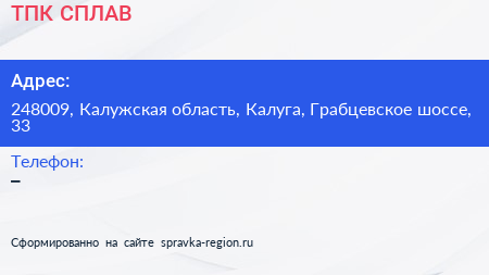 ТПК СПЛАВ по адресу 248009, Калужская область, Калуга, Грабцевское шоссе, 33 в дальнейшем Организация, размещена в следующих категориях: