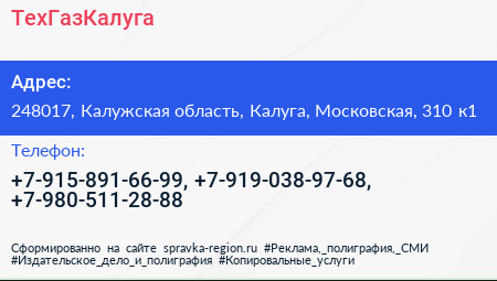 ТехГазКалуга по адресу 248017, Калужская область, Калуга, Московская, 310 к1 в дальнейшем Организация, размещена в следующих категориях:
