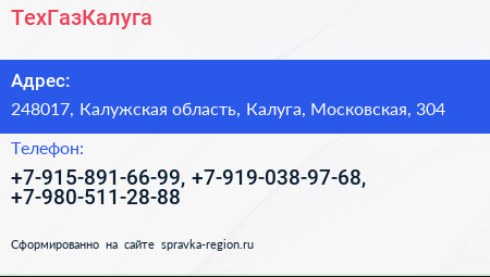 ТехГазКалуга по адресу 248017, Калужская область, Калуга, Московская, 304 в дальнейшем Организация, размещена в следующих категориях: