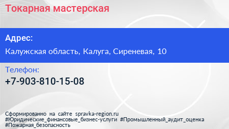 Токарная мастерская по адресу Калужская область, Калуга, Сиреневая, 10 в дальнейшем Организация, размещена в следующих категориях: