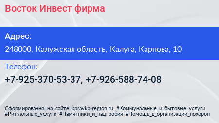 Восток Инвест, фирма по адресу 248000, Калужская область, Калуга, Карпова, 10 в дальнейшем Организация, размещена в следующих категориях: