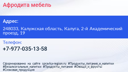 Афродита мебель по адресу 248033, Калужская область, Калуга, 2-й Академический проезд, 19 в дальнейшем Организация, размещена в следующих категориях:
