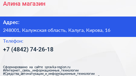 Алина, магазин по адресу 248001, Калужская область, Калуга, Кирова, 16 в дальнейшем Организация, размещена в следующих категориях: