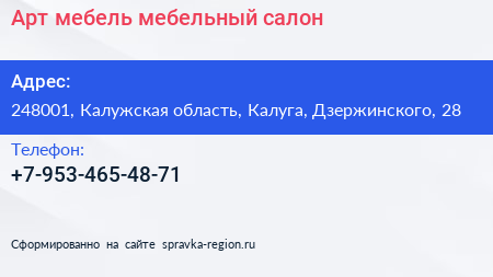 Арт мебель, мебельный салон по адресу 248001, Калужская область, Калуга, Дзержинского, 28 в дальнейшем Организация, размещена в следующих категориях: