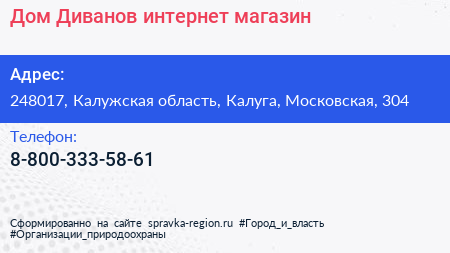 Дом Диванов, интернет-магазин по адресу 248017, Калужская область, Калуга, Московская, 304 в дальнейшем Организация, размещена в следующих категориях: