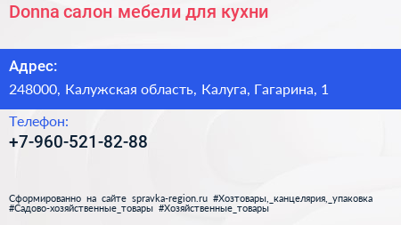 Donna, салон мебели для кухни по адресу 248000, Калужская область, Калуга, Гагарина, 1 в дальнейшем Организация, размещена в следующих категориях: