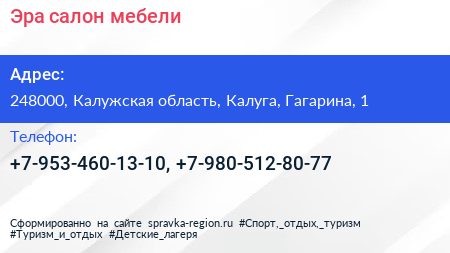 Эра, салон мебели по адресу 248000, Калужская область, Калуга, Гагарина, 1 в дальнейшем Организация, размещена в следующих категориях: