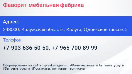 Фаворит, мебельная фабрика по адресу 248000, Калужская область, Калуга, Одоевское шоссе, 5 в дальнейшем Организация, размещена в следующих категориях: