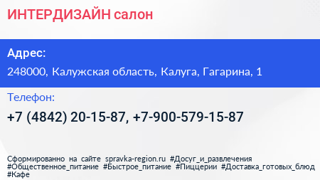 ИНТЕРДИЗАЙН, салон по адресу 248000, Калужская область, Калуга, Гагарина, 1 в дальнейшем Организация, размещена в следующих категориях: