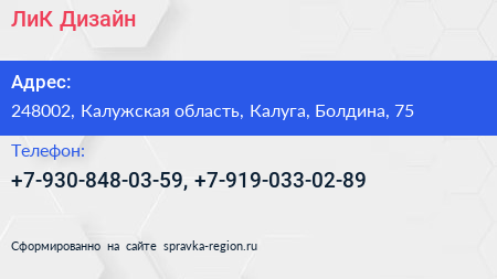 ЛиК Дизайн по адресу 248002, Калужская область, Калуга, Болдина, 75 в дальнейшем Организация, размещена в следующих категориях: