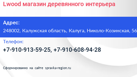Lwood, магазин деревянного интерьера по адресу 248002, Калужская область, Калуга, Николо-Козинская, 56 в дальнейшем Организация, размещена в следующих категориях: