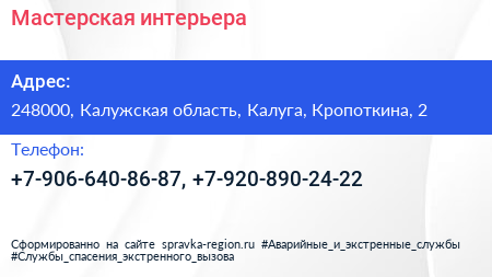 Мастерская интерьера по адресу 248000, Калужская область, Калуга, Кропоткина, 2 в дальнейшем Организация, размещена в следующих категориях: