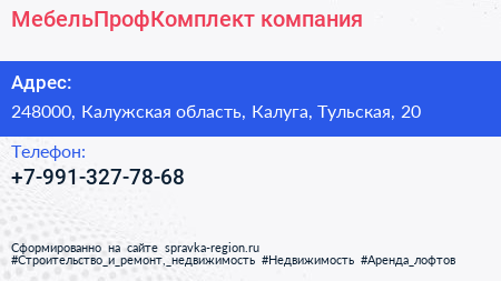 МебельПрофКомплект, компания по адресу 248000, Калужская область, Калуга, Тульская, 20 в дальнейшем Организация, размещена в следующих категориях: