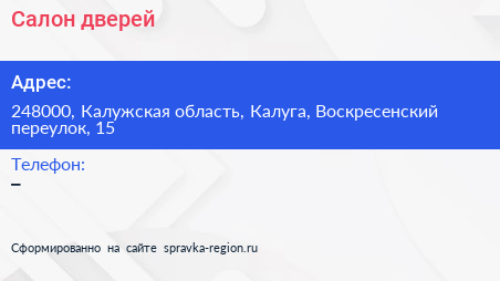 Салон дверей по адресу 248000, Калужская область, Калуга, Воскресенский переулок, 15 в дальнейшем Организация, размещена в следующих категориях: