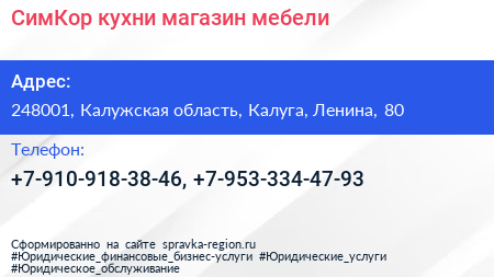СимКор кухни, магазин мебели по адресу 248001, Калужская область, Калуга, Ленина, 80 в дальнейшем Организация, размещена в следующих категориях: