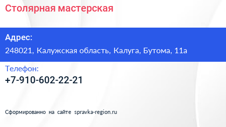 Столярная мастерская по адресу 248021, Калужская область, Калуга, Бутома, 11а в дальнейшем Организация, размещена в следующих категориях: