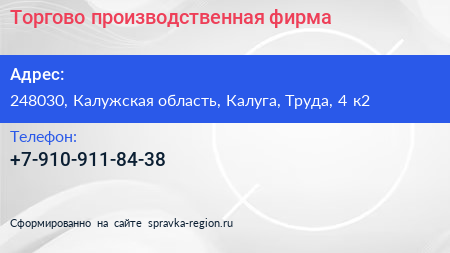 Торгово-производственная фирма по адресу 248030, Калужская область, Калуга, Труда, 4 к2 в дальнейшем Организация, размещена в следующих категориях: