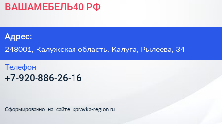 ВАШАМЕБЕЛЬ40.РФ по адресу 248001, Калужская область, Калуга, Рылеева, 34 в дальнейшем Организация, размещена в следующих категориях: