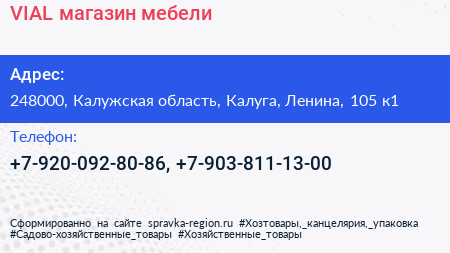 VIAL, магазин мебели по адресу 248000, Калужская область, Калуга, Ленина, 105 к1 в дальнейшем Организация, размещена в следующих категориях: