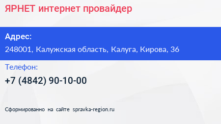 ЯРНЕТ, интернет-провайдер по адресу 248001, Калужская область, Калуга, Кирова, 36 в дальнейшем Организация, размещена в следующих категориях: