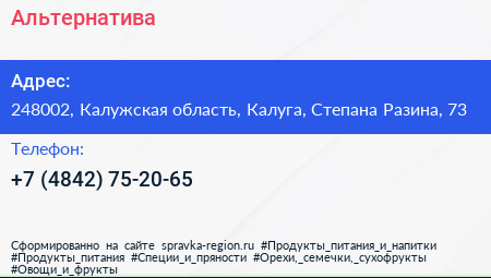 Альтернатива по адресу 248002, Калужская область, Калуга, Степана Разина, 73 в дальнейшем Организация, размещена в следующих категориях: