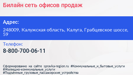 Билайн, сеть офисов продаж по адресу 248009, Калужская область, Калуга, Грабцевское шоссе, 59 в дальнейшем Организация, размещена в следующих категориях:
