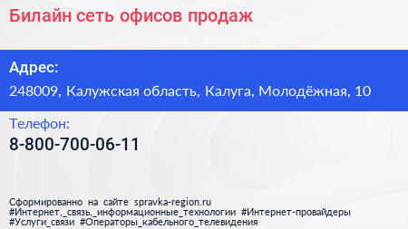 Билайн, сеть офисов продаж по адресу 248009, Калужская область, Калуга, Молодёжная, 10 в дальнейшем Организация, размещена в следующих категориях: