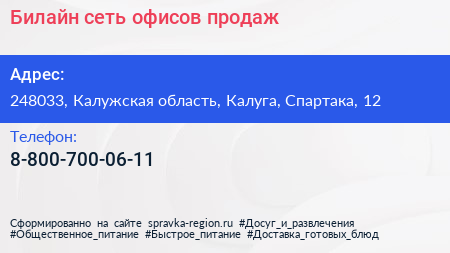 Билайн, сеть офисов продаж по адресу 248033, Калужская область, Калуга, Спартака, 12 в дальнейшем Организация, размещена в следующих категориях: